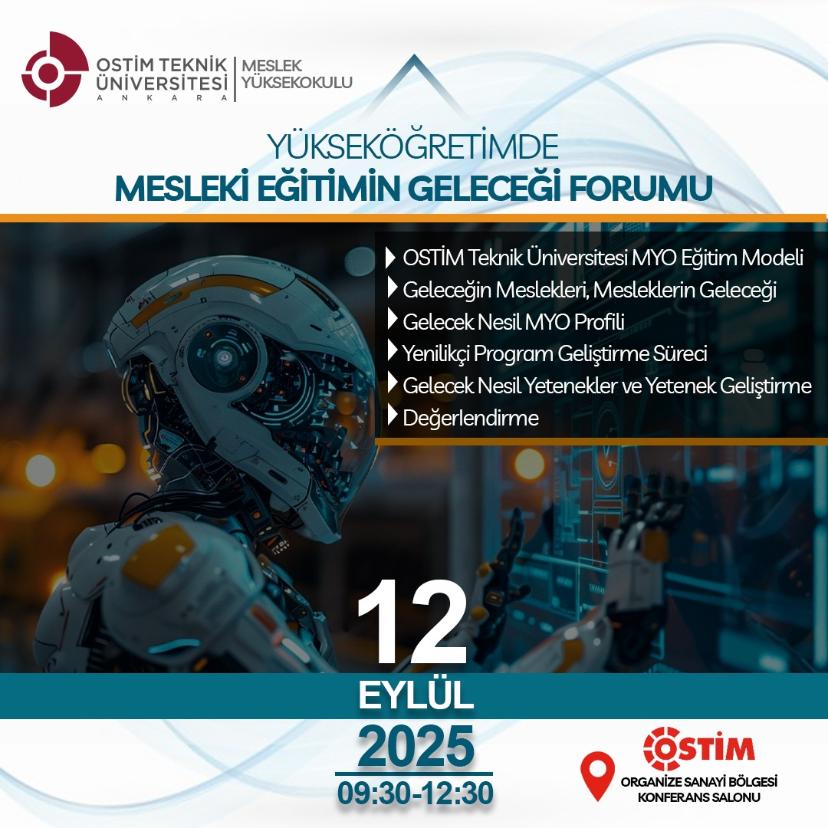 Dijital dönüşümün hızla şekillendirdiği çağımızda, mesleki eğitimin geleceğini çok boyutlu bir bakış açısıyla ele almak amacıyla OSTİM Teknik Üniversitesi Meslek Yüksekokulu tarafından “Yükseköğretimde Mesleki Eğitimin Geleceği Forumu” düzenlenmektedir.